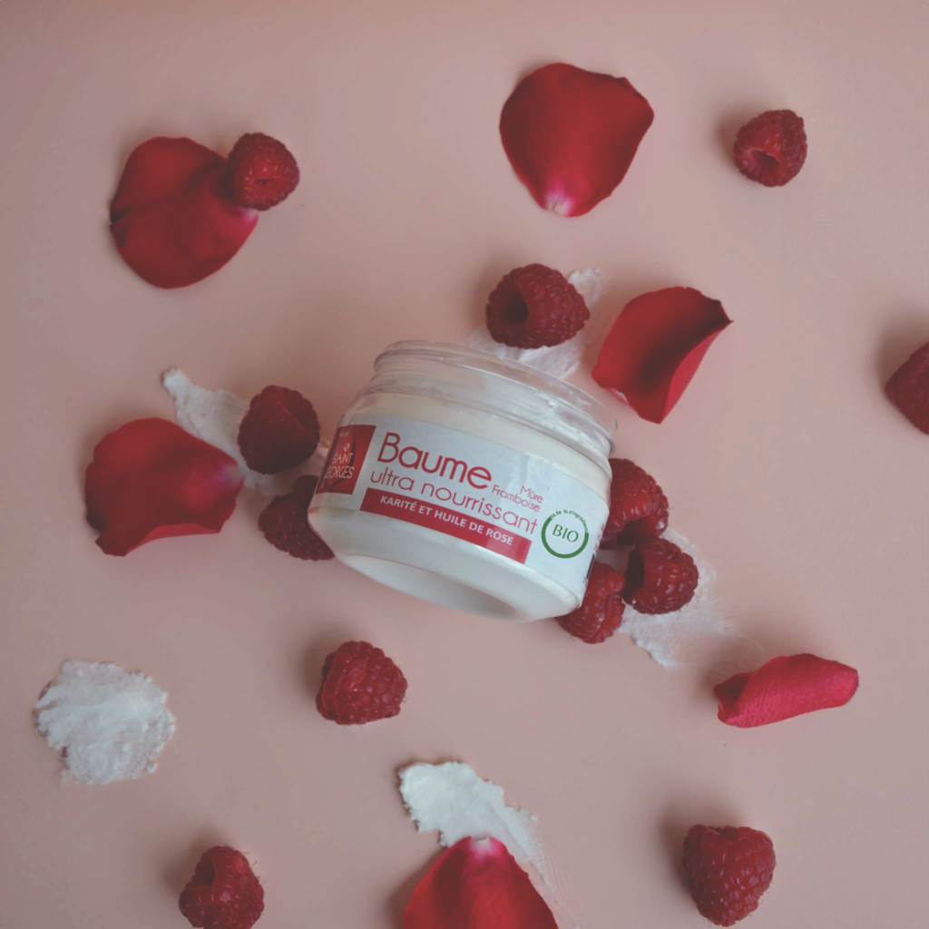 Beurre de karité, huile de rose musquée, concentrés 100 % naturels de mûre et de framboise.